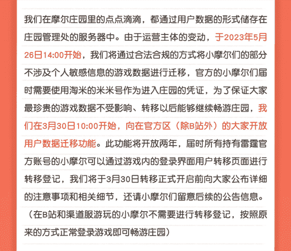 合作结束本就是开发方和代理方双方的事情,,降低这件事情对玩家的影响,,,才是对所有珍视这段童年的摩尔玩家最好的呵护。。。目前看来,,用户完全不用担心后续因无法登录游戏而造成任何数据上的损失,,只要及时进行账号转移,,,就可以好好保留、、、、延续在庄园的痕迹和回忆,,,继续在庄园里做快乐的红鼻子小鼹鼠。。。